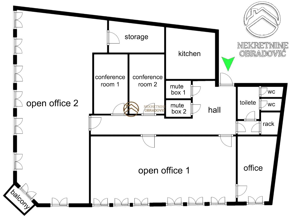 Dve velike prostorije otvorenog tipa svaka za maksimalno 12 do 14 osoba, dve sale za sastanke, kancelarija, ostava, kuhinja, dva toaleta, dve prostorije(mute box).