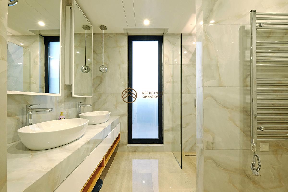 Od prostorija, ova nekretnina poseduje: Prostrano predsoblje koje odvaja dnevni zajednicki prostor (salon, trpezarija, kuhinja, dve prostrane terase, toalet, veseraj) od intimnog spavaceg bloka ( cetiri spavace sobe, svaka sa sopstvenim kupatilom).