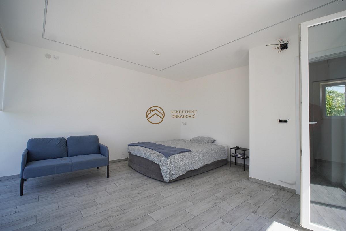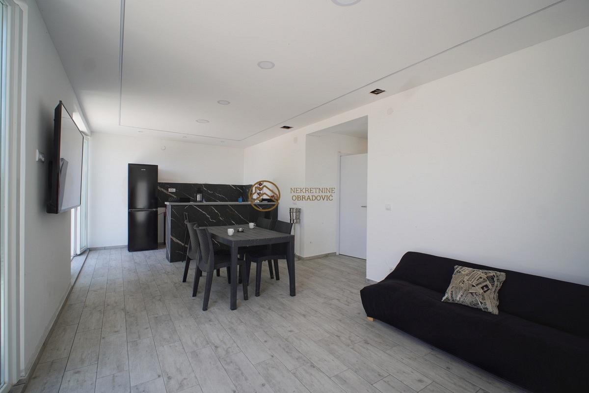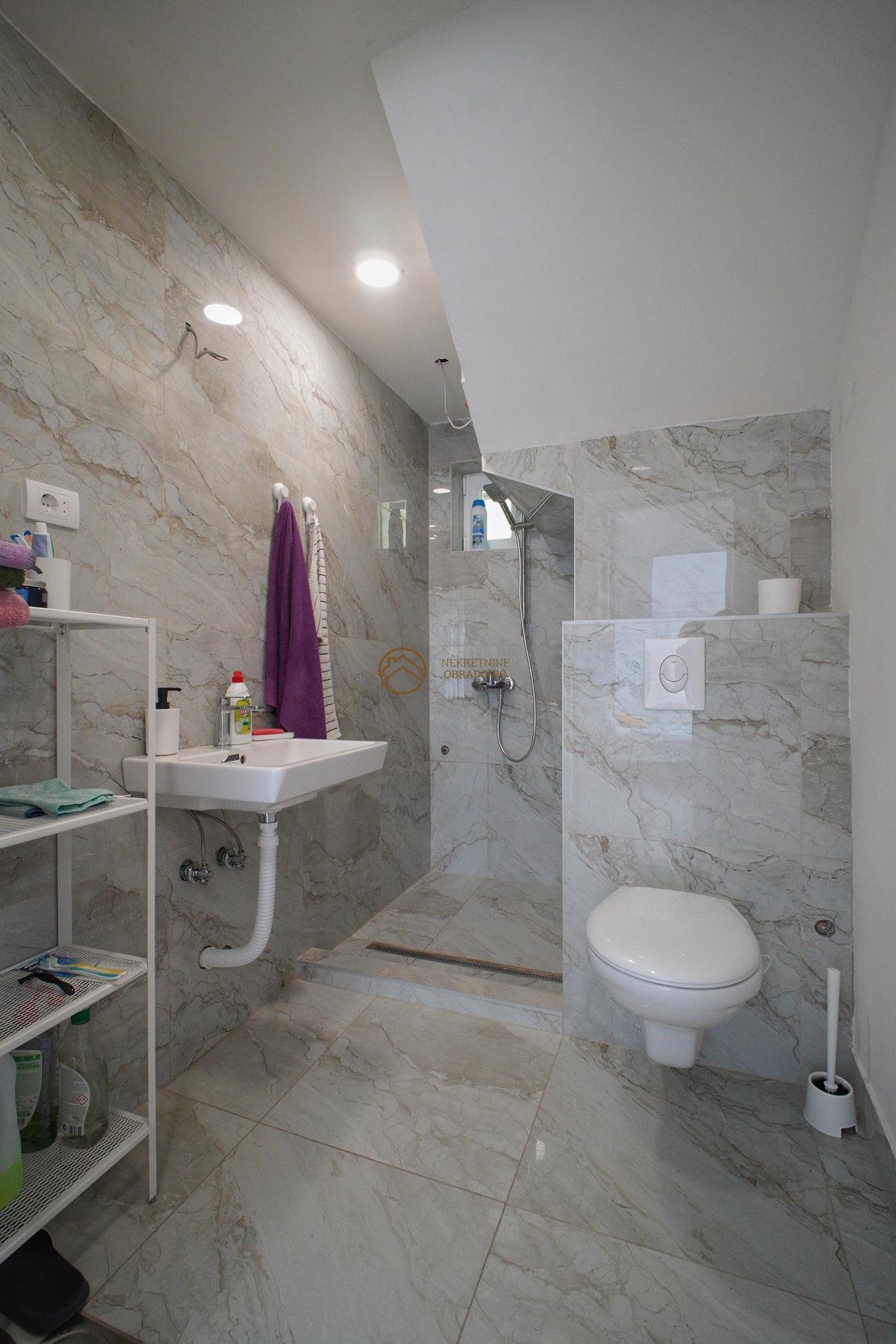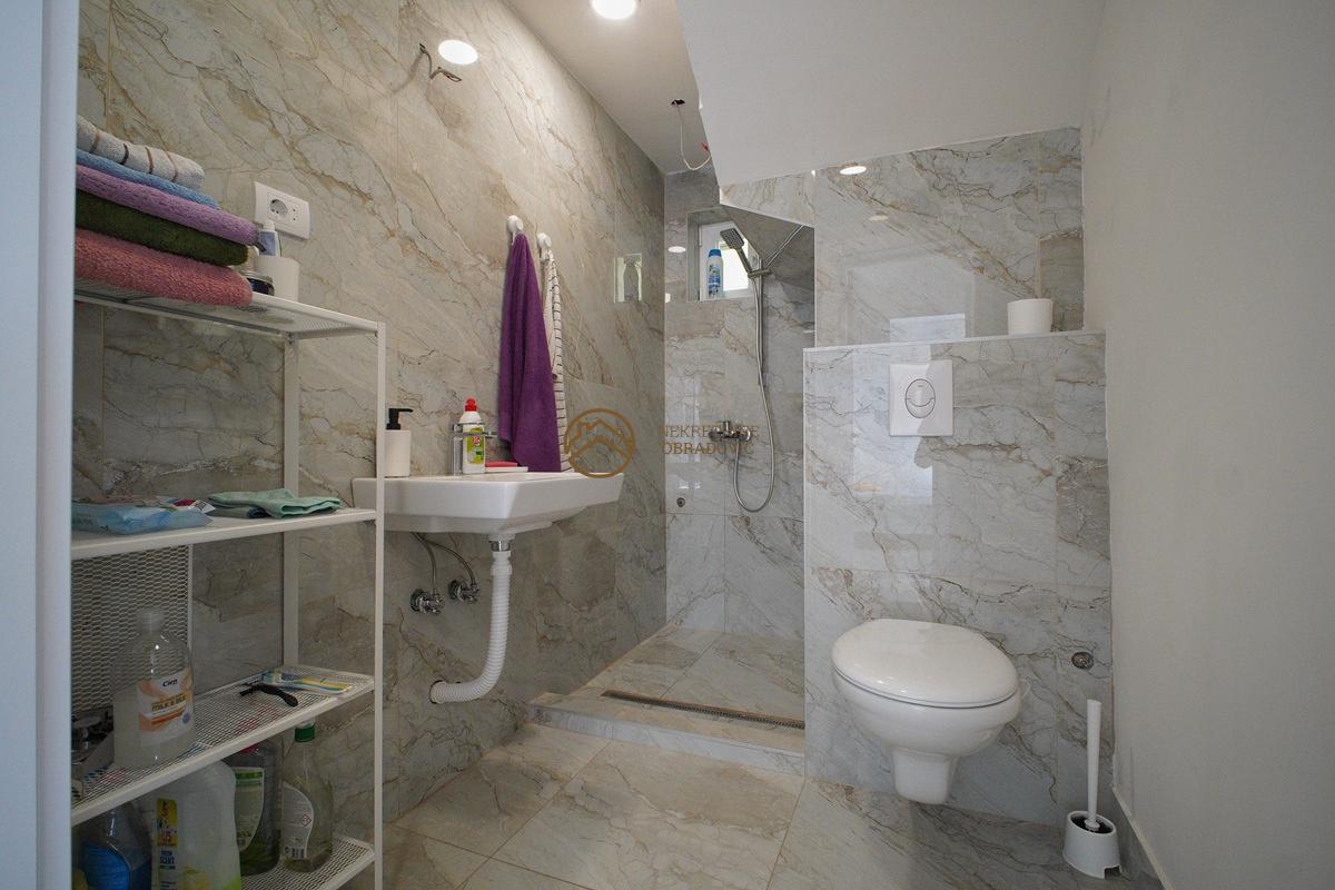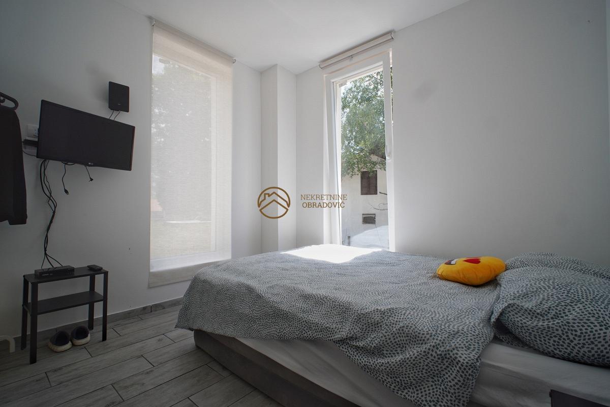 Dnevni boravak sa trpezarijom, kuhinja,dva kupatila, dve spavace sobe, veliki balkon, lodja, letnjikovac sa zidanim rostiljem u prelepom dvoristu.