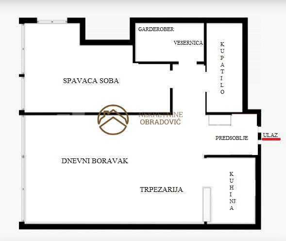 Ulazni prostor, dnevni boravak trpezarijom i uvucenom kuhinjom, spavaca soba, kupatilo, degazman, garderober/vesernica.