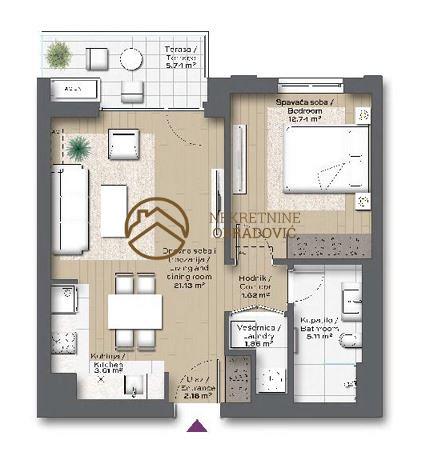 Ulazni prostor, hodnik, dnevni boravak sa trpezarijom i kuhinjom, spavaca soba, kupatilo, tehnicka prostorija/vesernica, terasa.