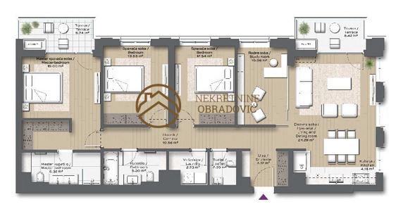 Ulazni prostor, hodnik, dnevni boravak sa trpezarijom i kuhinjom, master spavaca soba sa garderoberom i master kupatilom, dve spavace sobe, radna soba, kupatilo, toalet, tehnicka prostorija/vesernica, dve terase.