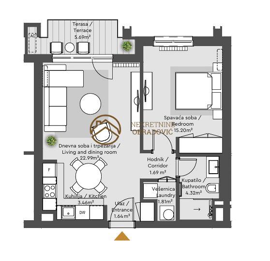 Ulazni prostor, dnevni boravak sa kuhinjom i trpezarijom, spavaca soba, kupatilo, tehnicka prostorija/vesernica, terasa.