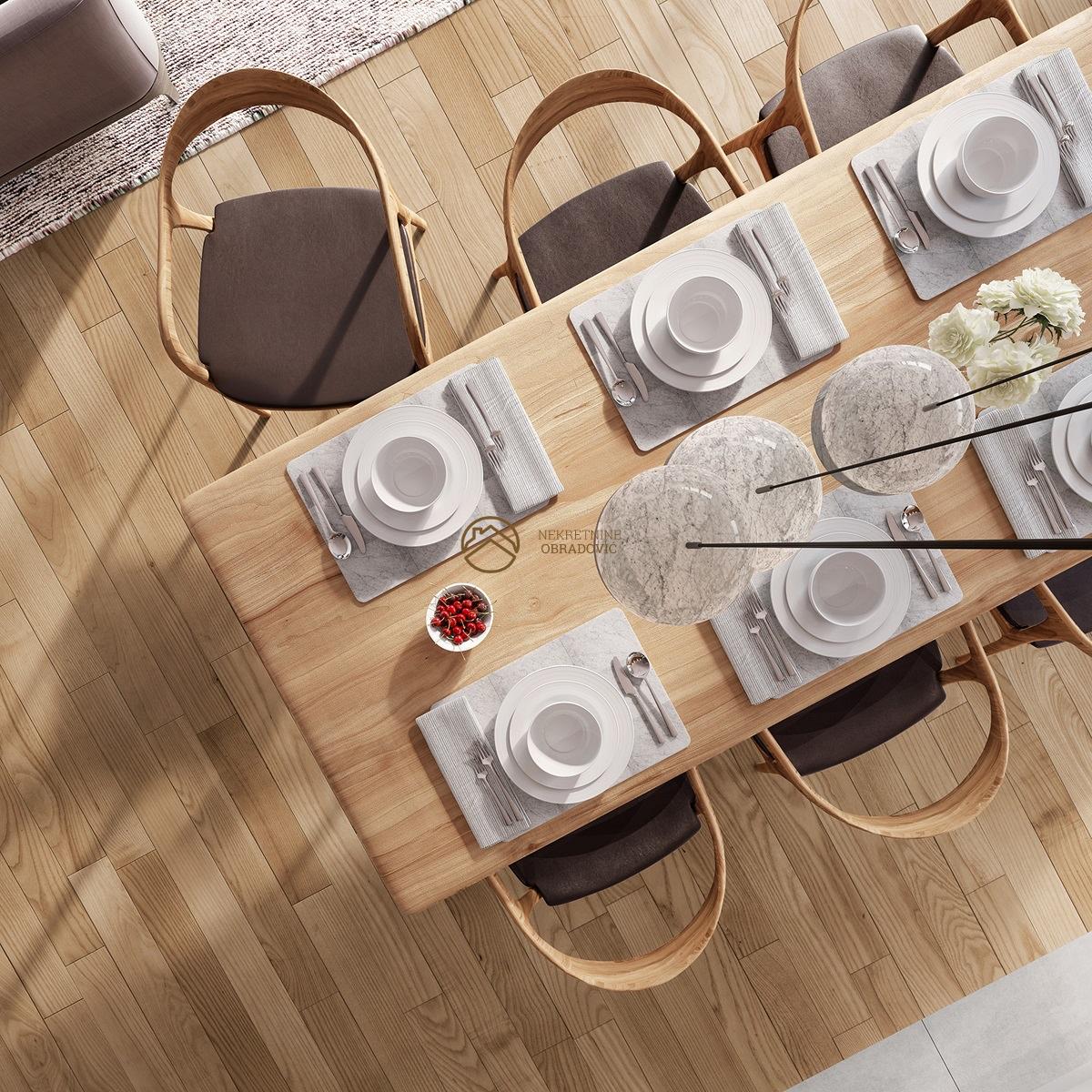 Ulazni prostor, dnevni boravak sa trpezarijom, master spavaca soba sa kupatilom i garderoberom, dve spavace sobe, kuhinja, kupatilo, toalet, teh. prostorija/vesernica, garderoberi, hodnik, terasa.