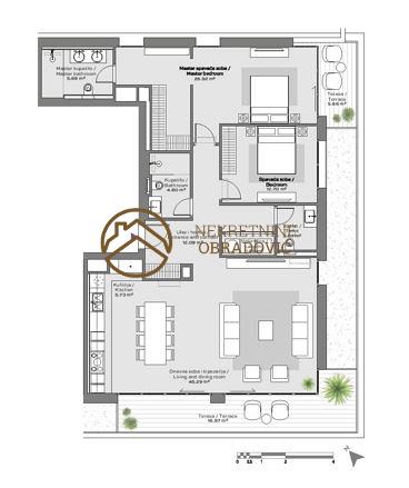 Ulazni prostor, dnevni boravak sa trpezarijom, master spavaca soba sa kupatilom i garderoberom, spavaca soba, kuhinja, kupatilo, toalet, tehnicka prostorija/vesernica, garderoberi, hodnik, dve terase.