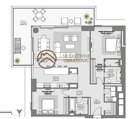 Ulazni prostor, dnevni boravak sa trpezarijom, master spavaca soba sa garderoberom i kupatilom, spavaca soba, kuhinja sa sank-trpezarijom, kupatilo, vesernica/teh.prostorija, hodnik, prostor za garderobere, terasa.