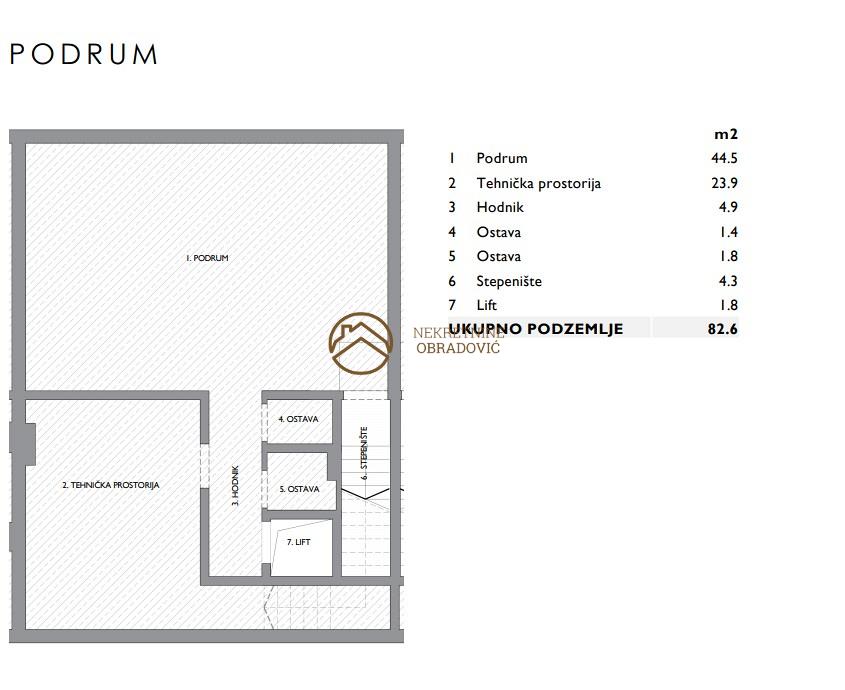 Podrum povrsine 82 m2, koji se sastoji od: podruma, tehnicke prostorije, hodnika, lifta,