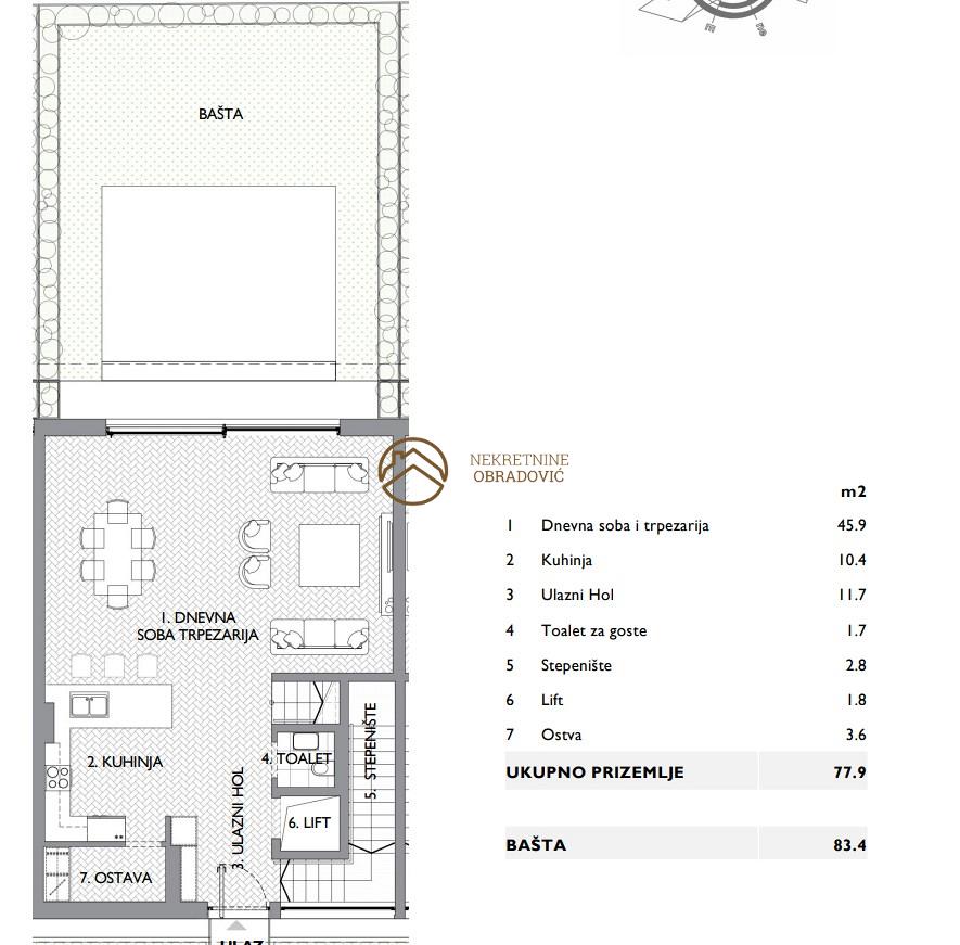 Prizemlje povrsine 78 m2 + basta od 83 m2, koje se sastoji od: dnevne sobe i trpezarije,