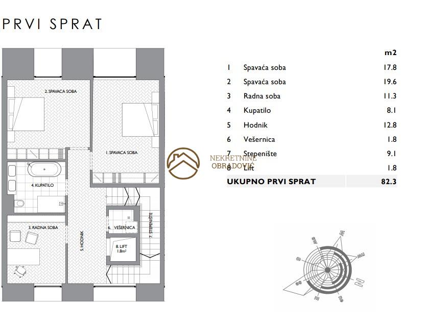Prvi sprat povrsine 83 m2, koji se sastoji od: 2 spavace sobe, radne sobe, kupatila,