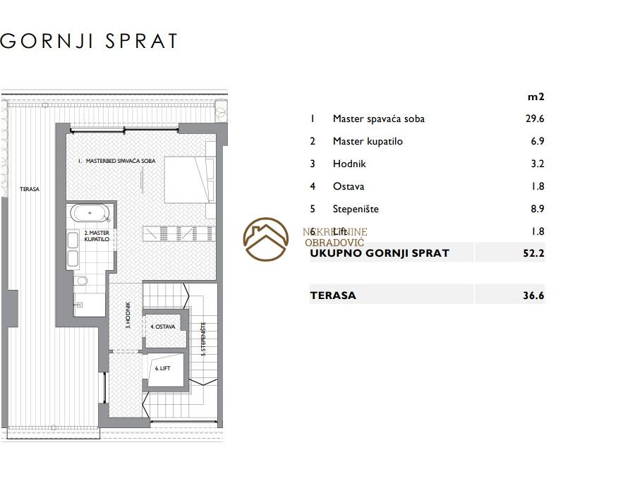 Drugi sprat, povrsine 52 m2 + 37 m2 terase, koje se sastoji od: master spavace sobe,