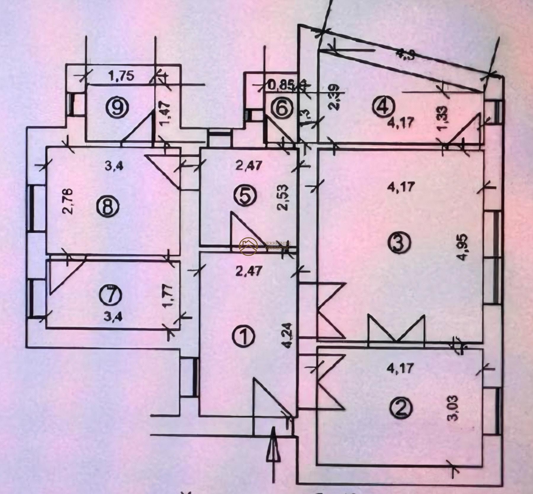 Salonsko predsoblje, dnevni boravak, spavaca soba, devojacka soba, kuhinja sa trpezarijom, degazman, kupatilo, toalet, ostava.
