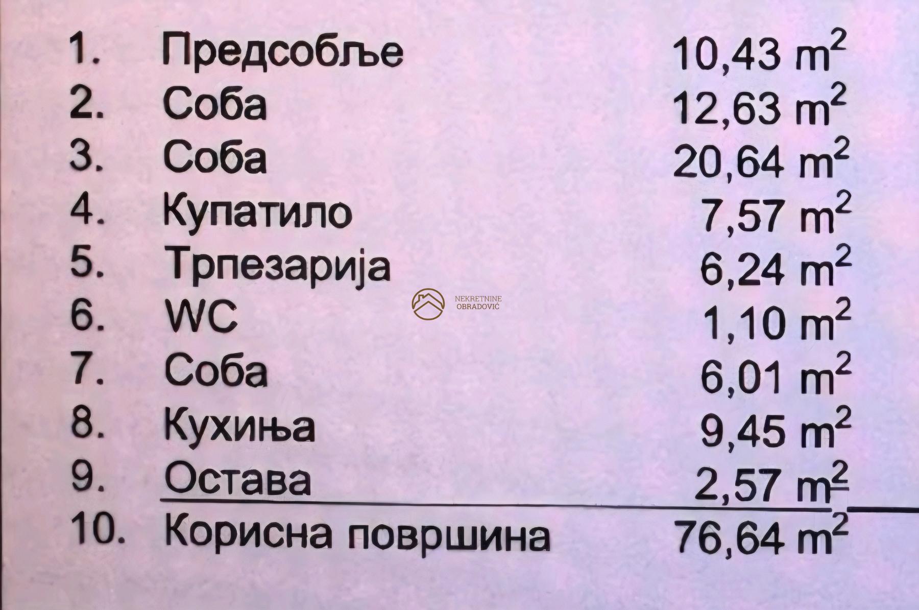 Stan raspolaze sa 77m2 neto povrsine(uknjizen bez tereta i zabelezbi), a pruza osecaj
