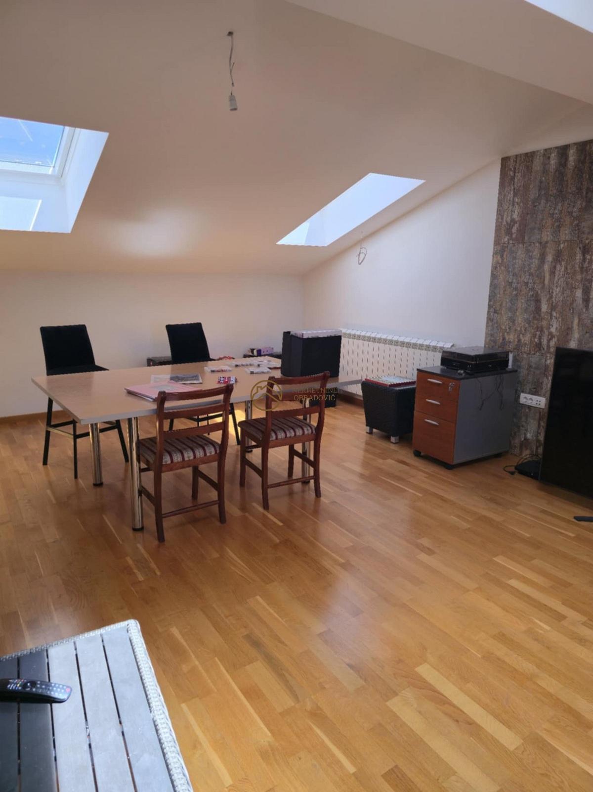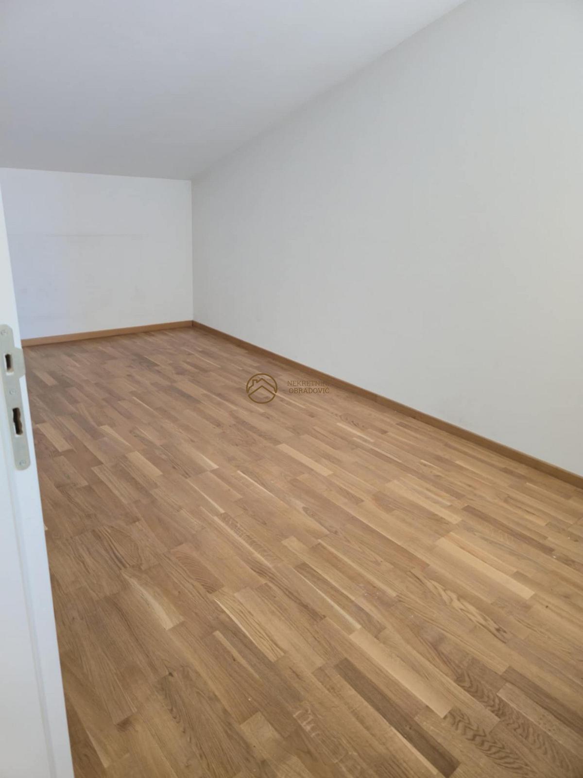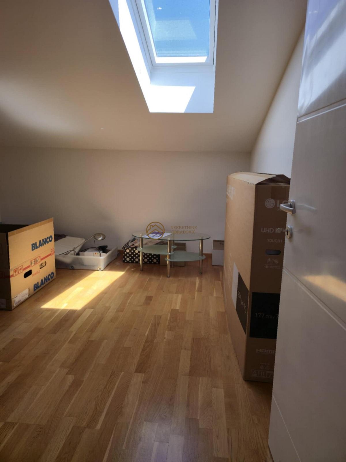 Dnevna soba sa kuhinjom i trpezarijom, 3 spavace sobe, toalet, 2 kupatila, 2 francuska balkona i terasa povrsine 44 m2.