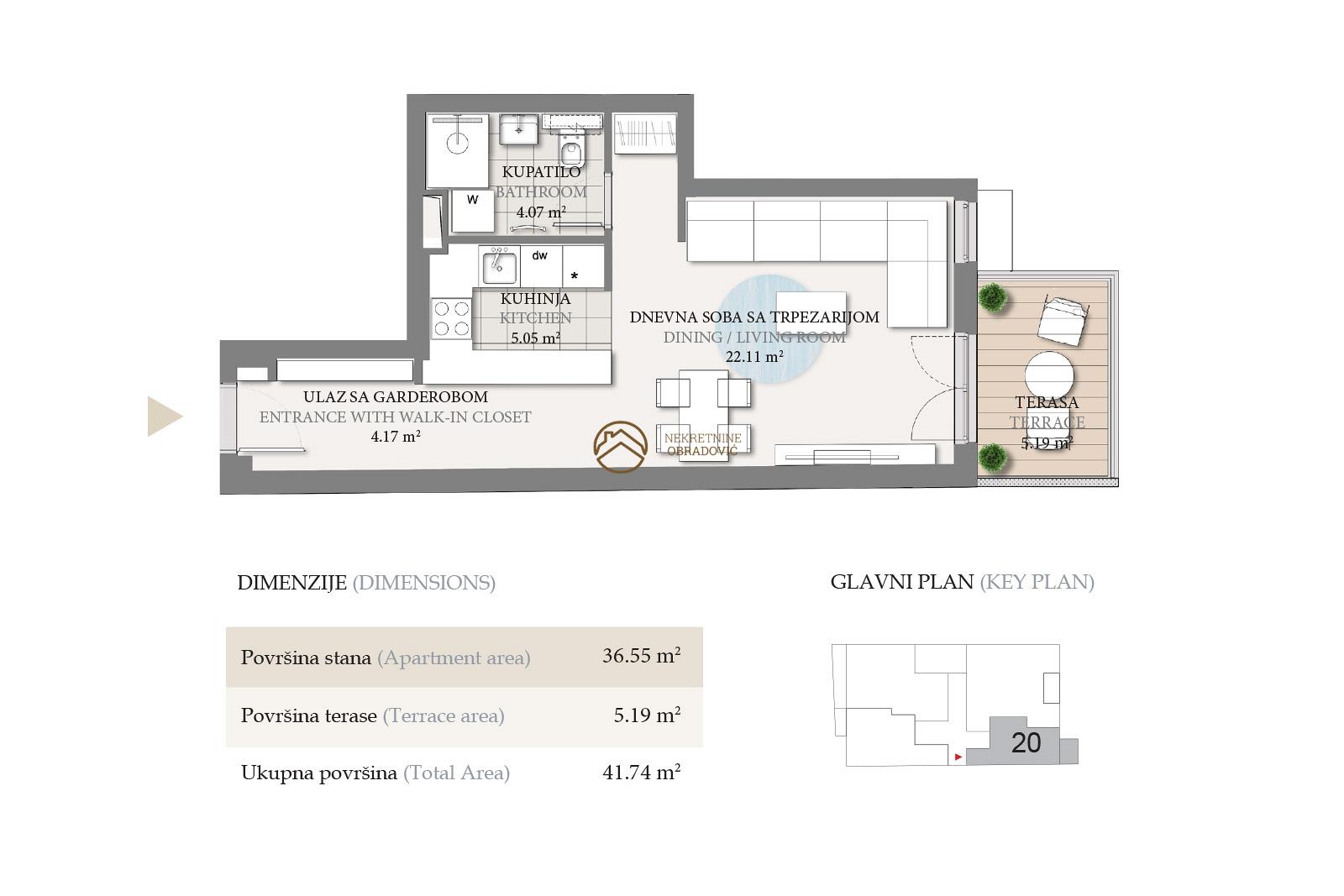 Stan br. 20 se nalazi na 5.om spratu, sve prostorije su svetle I prostrane ukljucujuci veliku terasu sa otvorenim pogledom na zelenilo. . Ono sto ga zaista izdvaja iz ponude je retkost malih stanova na ovoj ekskluzivnoj lokaciji, pa se time namece kao ultimativan izbor za ljude koji zele pametno da plasiraju svoj novac. Izuzetna investicija.