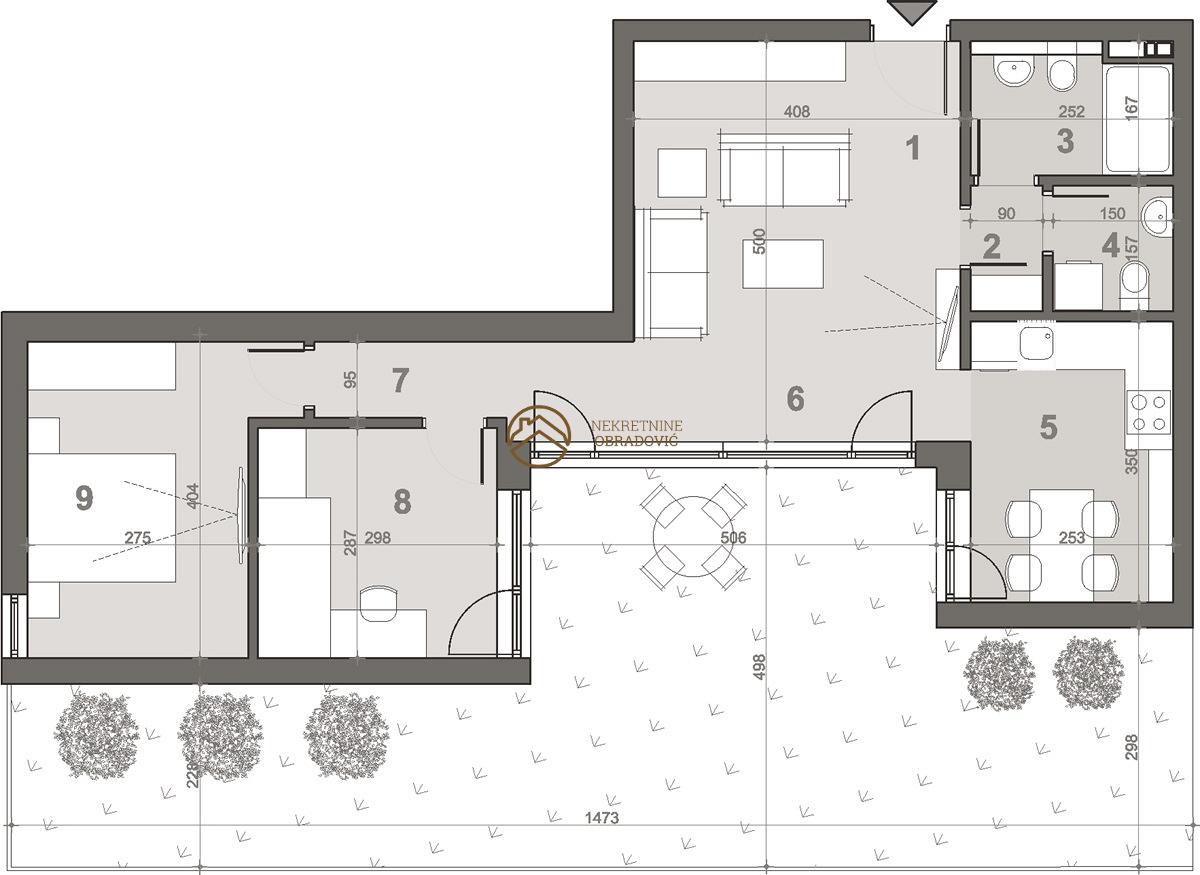 Dnevna soba, kuhinja sa trpezarijom, dve spavace sobe, kupatilo, toalet, hodnik, degazman.