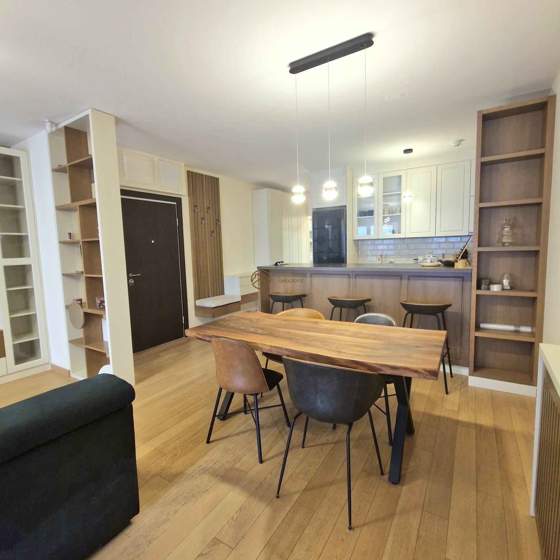 Od opreme u stanu izdvajamo drvo-alu stolariju sa troslojnim staklom, podno grejanje