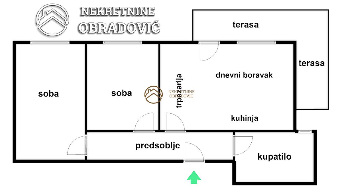 Predsoblje,kuhinja,dnevo-trpezarijski deo,dve spavace sobe,kupatilo,terasa,garaza.