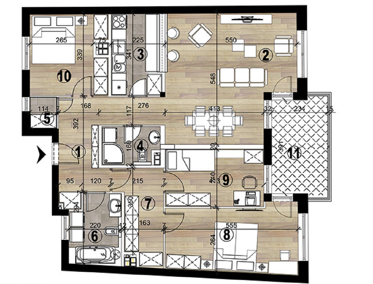 Hodnik, toalet, kupatilo, kuhinja, dnevna soba, tri spavace sobe.