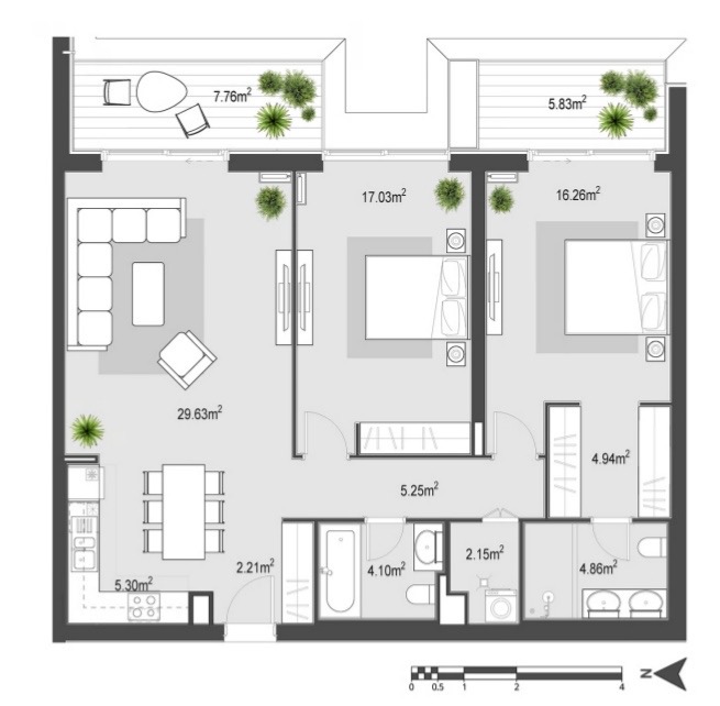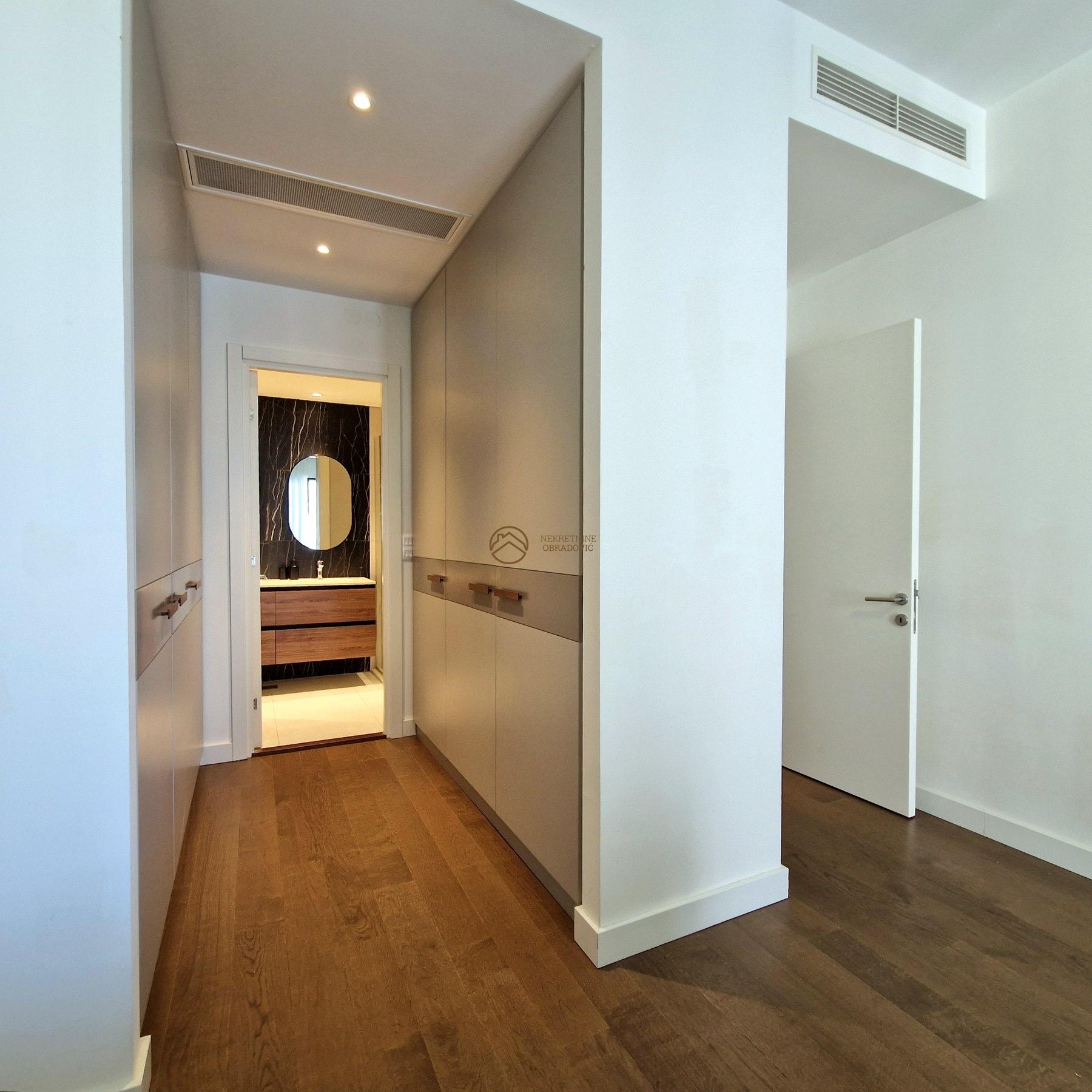 Ulazni prostor, dnevni boravak sa trpezarijom, master spavaca soba sa kupatilom i garderoberom, spavaca soba sa garderoberom, kuhinja, drugo kupatilo, tehnicka prostorija, dve terase.