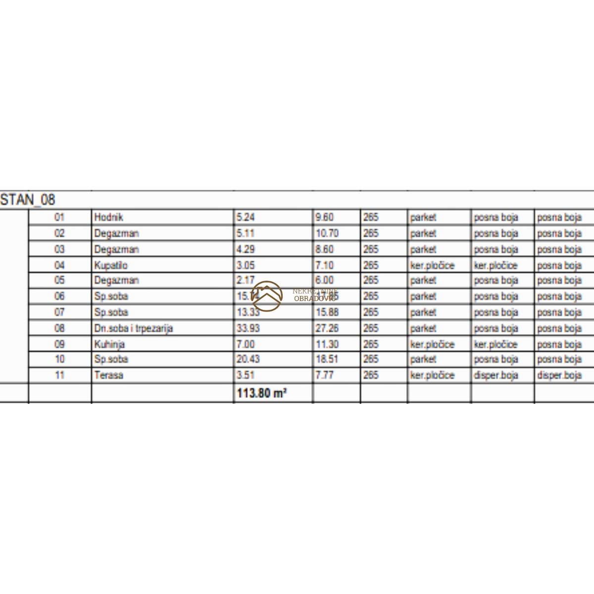 Dnevna soba sa trpezarijom, kuhinja, tri spavace sobe, dva kupatila, toalet, hodnici i terasa.