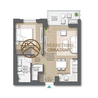 Ulazni prostor, dnevni boravak sa kuhinjom i trpezarijom, spavaca soba, kupatilo, tehnicka prostorija/vesernica, hodnik, terasa.