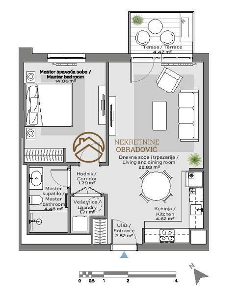 Ulazni prostor, dnevni boravak sa trpezarijom, master spavaca soba, kuhinja, master kupatilo, tehnicka prostorija/vesernica, garderoberi, hodnik, terasa.