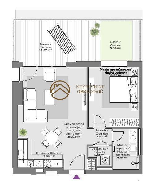 Prostrana terasa, u cijem nastavku je i uredjena basta okruzeni su zelenilom koje daje osecaj privatnosti i intime, cemu doprinosi i orijentacija stana - ka centralnom zajednickom dvoristu.