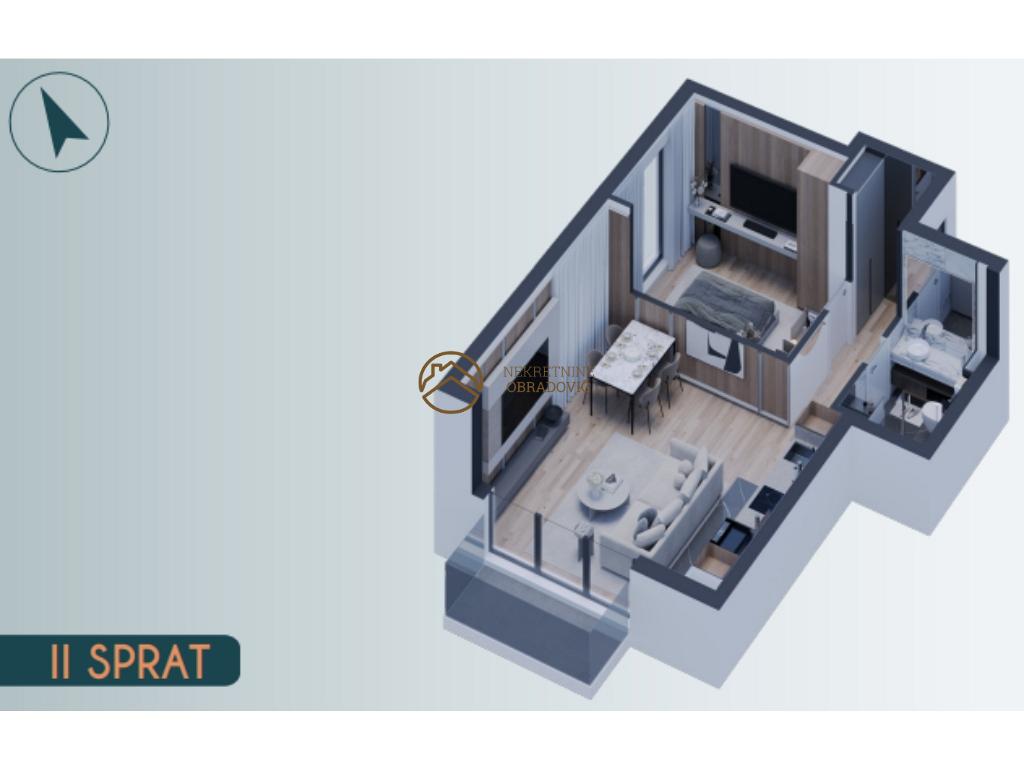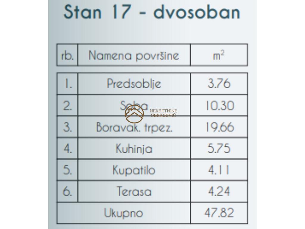 U ponudi je funkcionalan dvosoban stan od 47.82m sa terasom na drugom spratu zgrade okruzene zelenilom.