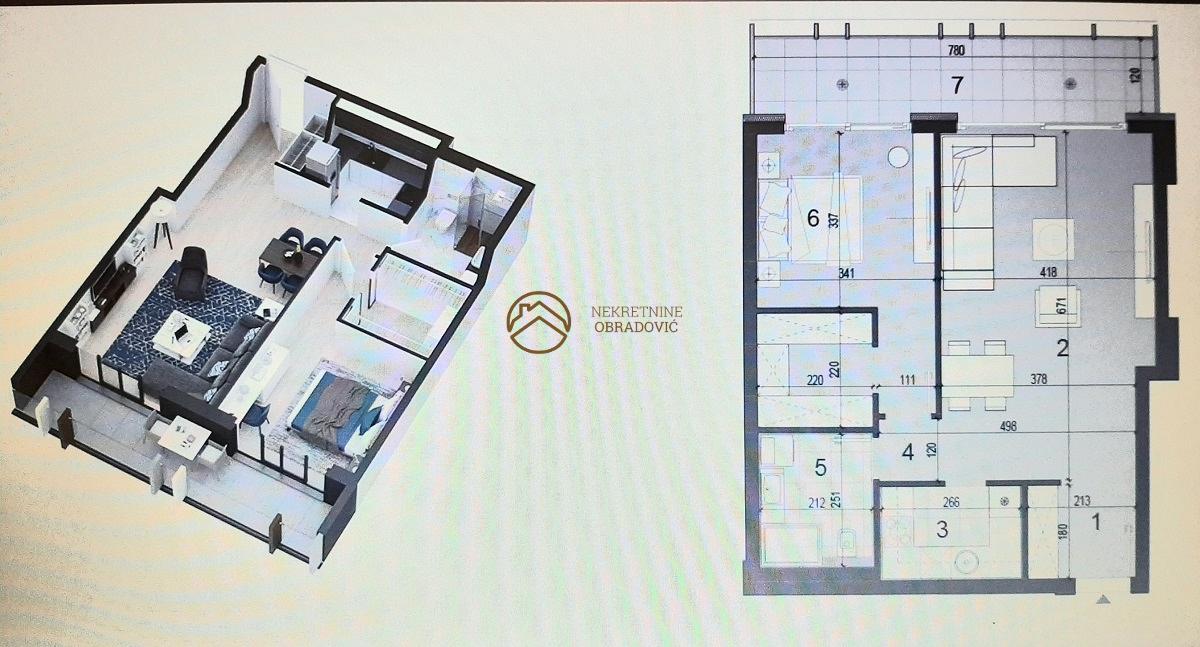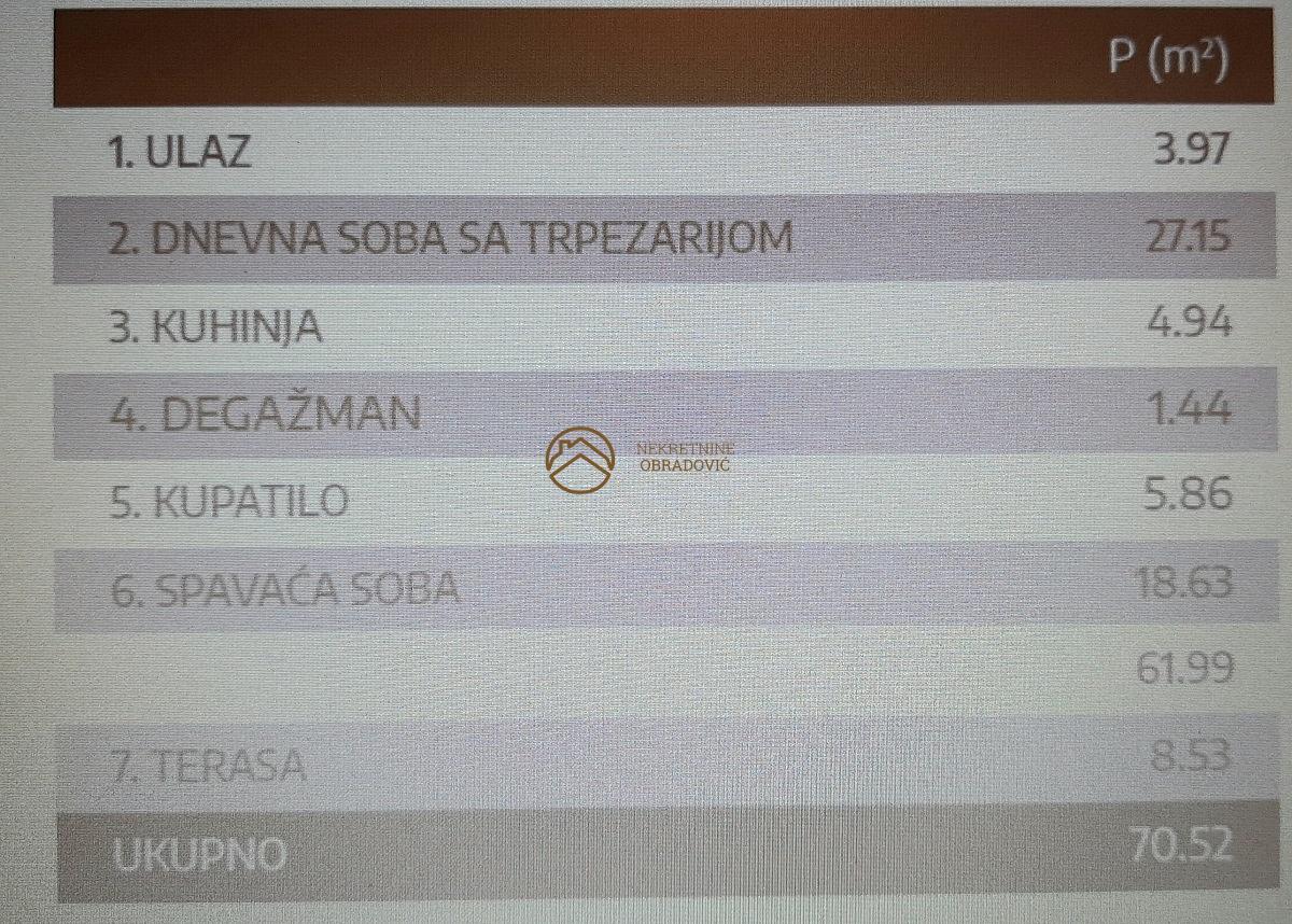Dnevna soba sa trpezarijom, kuhinja, spavaca soba, kupatilo, degazman, terasa.