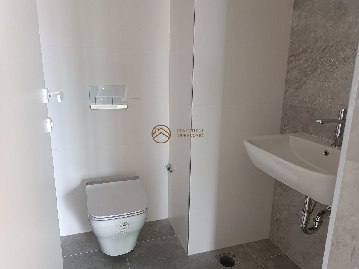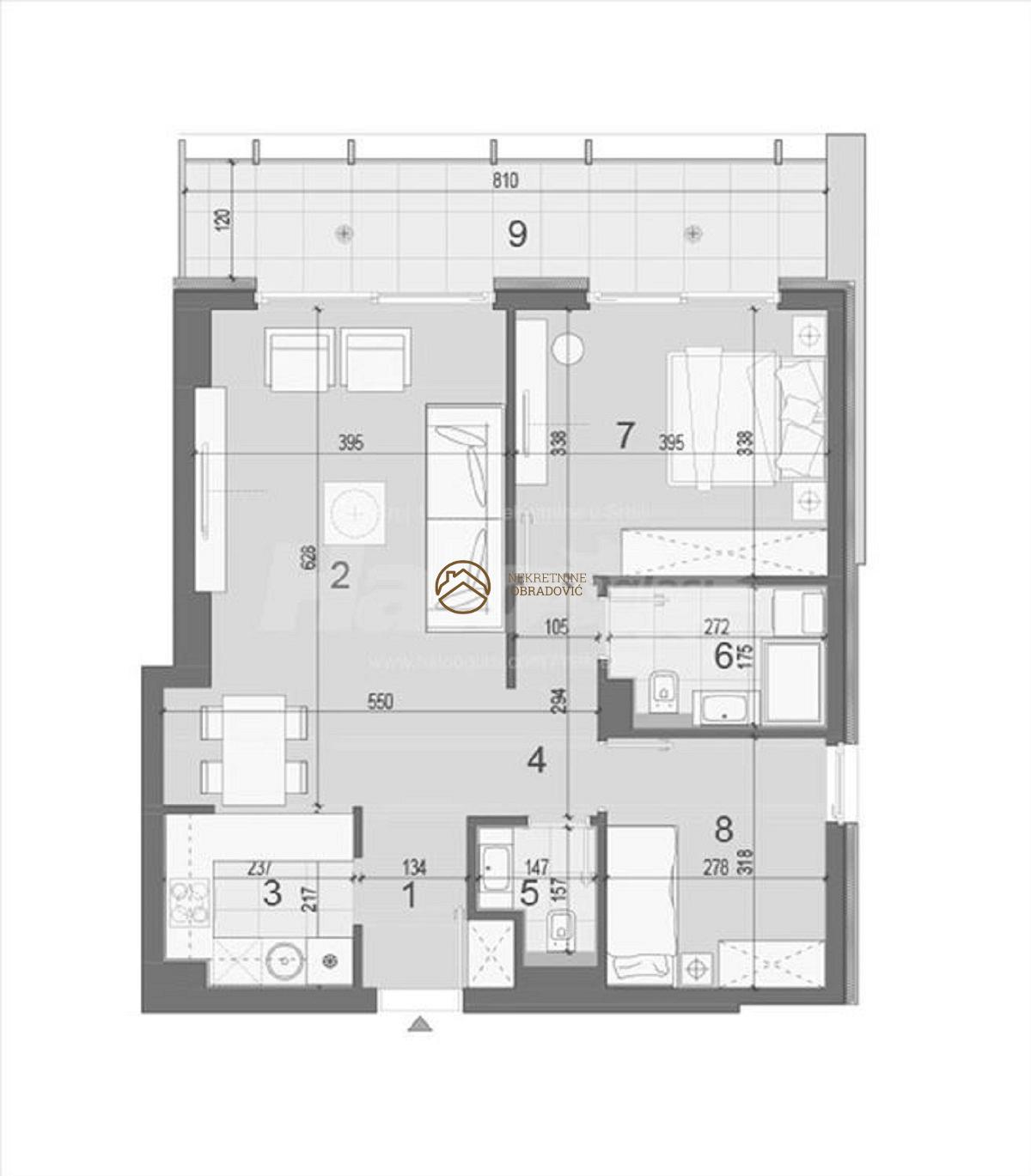 Hodnik, dnevni boravak, kuhinja, trpezarija, dve spavace sobe kupatilo, toalet, terasa.