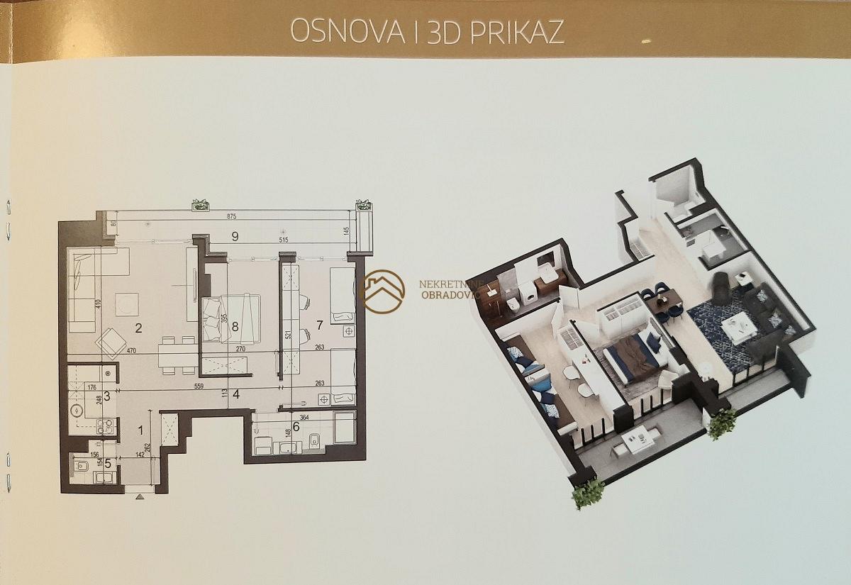 Dnevna soba sa trpezarijom, kuhinja, dve spavace sobe, kupatilo, toalet, degazman, terasa.