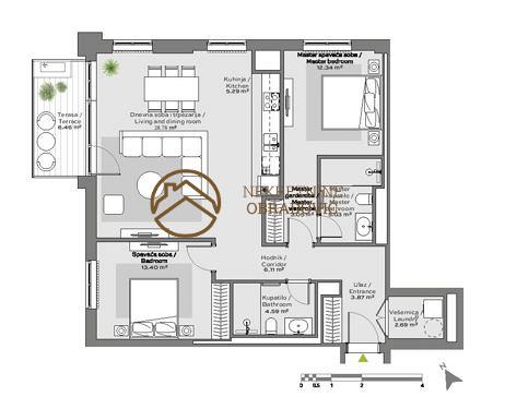 Ulazni prostor, dnevni boravak sa trpezarijom, master spavaca soba sa master kupatilom, spavaca soba, kuhinja, kupatilo, teh. prostorija/vesernica, garderoberi, hodnik, terasa.
