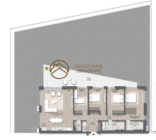 U ponudi je ekskluzivan, trostrano orijentisan, petosoban stan na prvoj etazi, sa prostranom terasom, povrsine184m2.