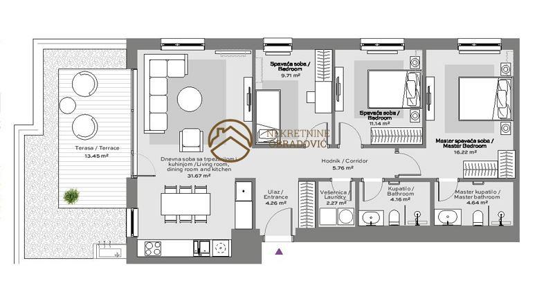 Ulazni prostor, dnevni boravak sa kuhinjom i trpezarijom, master spavaca soba sa master kupatilom, dve spavace sobe, kupatilo, tehnicka prostorija/vesernica, hodnik, terasa.