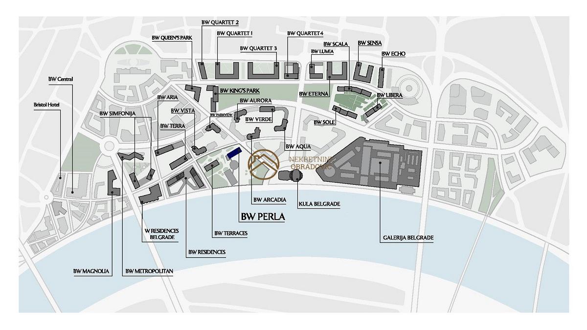 BW Perla - novi premium stambeno-poslovni objekat u kompleksu Beograd na vodi sa direktnim izlazom na Sava Promenadu. Zgrada raspolaze sa 189 stambenih jedinica - od jednosobnih do stanova sa pet spavacih soba, rasporedjenih na 25 spratova. BW Perlu karakterisu savremena arhitektonska resenja, visina plafona od 2,9m, najvisi kvalitet zavrsnih radova, vrhunski dizajn enterijera, stakla od zida do zida kao i prostrane panoramske terase koje krasi spektakularan pogled. Prvoklasna lokacija zgrade pruza jedinstvene mogucnosti u pogledu zivotnog stila svih generacija - blizina skole i vrtica, maloprodajni i ugostiteljski objekti, Savski park, Kula Beograd i Shopping centar Galerija. Osim savrsene pozicije i dinamicnog okruzenja, ovo prestizno zdanje svojim stanarima nudi lobi sa recepcijom, fizicko-tehnicko obezbedjenje 24/7 i ekskluzivni wellness centar sa bazenom, teretanom, saunom i delom za spa usluge.