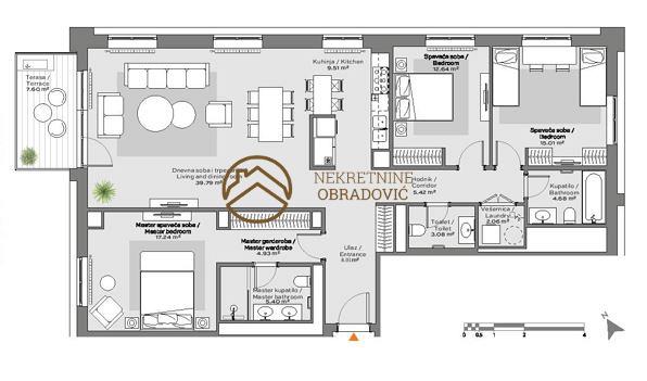 Ulazni prostor, dnevni boravak sa trpezarijom, master spavaca soba sa kupatilom i garderoberom, dve spavace sobe, kuhinja, kupatilo, toalet, teh. prostorija/vesernica, garderoberi, hodnik, terasa.