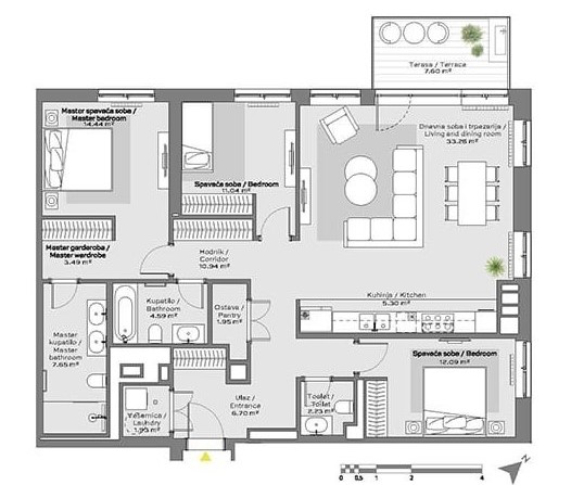Ulazni prostor, dnevna zona sa trpezarijom i kuhinjom, master spavaca soba sa kupatilom, dve spavace sobe, kupatilo, toalet, tehnicka prostorija/vesernica, degazmani, hodnik, ostava, terasa.