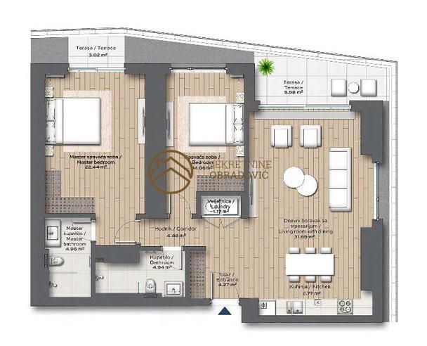 U ponudi je trosoban stan na petoj etazi, povrsine 105m2, orijentisan gradu i zelenoj oazi.