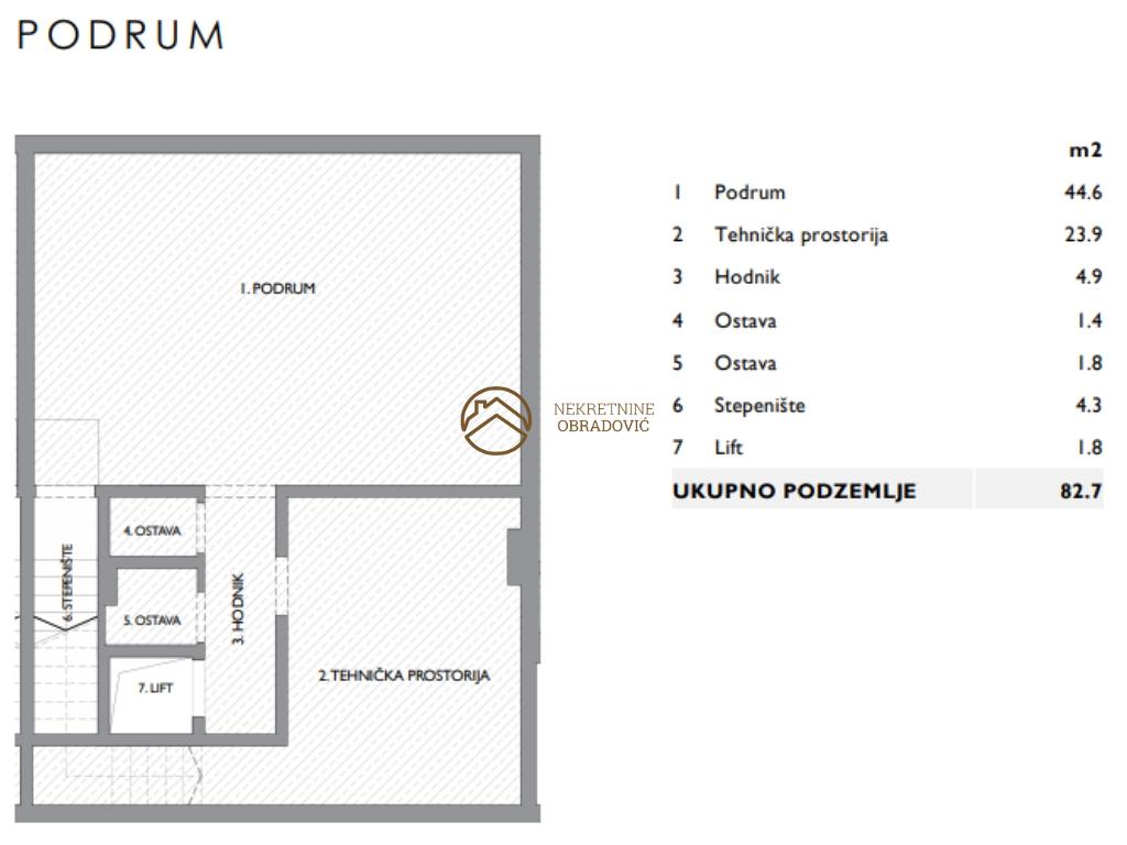 Podrum:povrsine 83 m2, koji se sastoji od: podruma, tehnicke prostorije, hodnika, lifta,