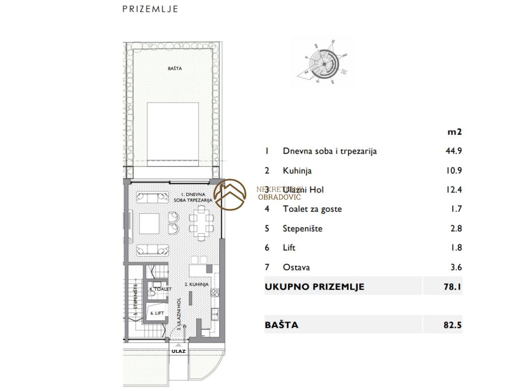 Prizemlje: povrsine 78 m2 + basta od 83 m2, koje se sastoji od: dnevne sobe i trpezarije,