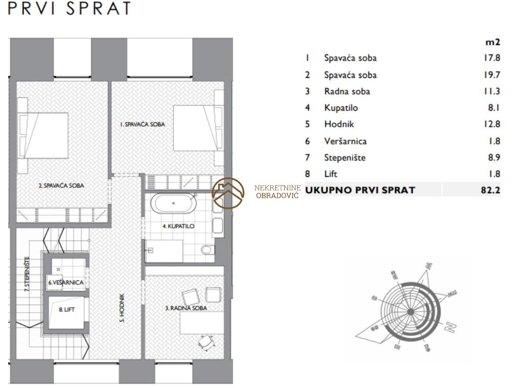 Prvi sprat:povrsine 82 m2, koji se sastoji od: 2 spavace sobe, radne sobe, kupatila,