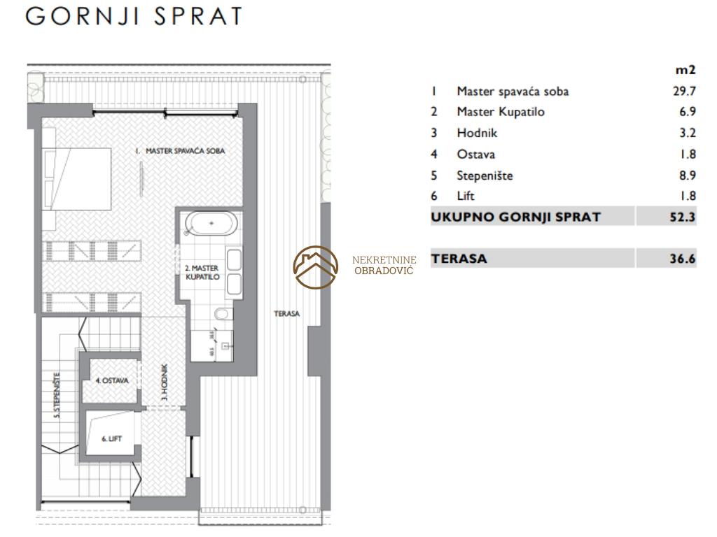 Drugi sprat: povrsine 52 m2 + 37 m2 terase, koje se sastoji od: master spavace sobe, master