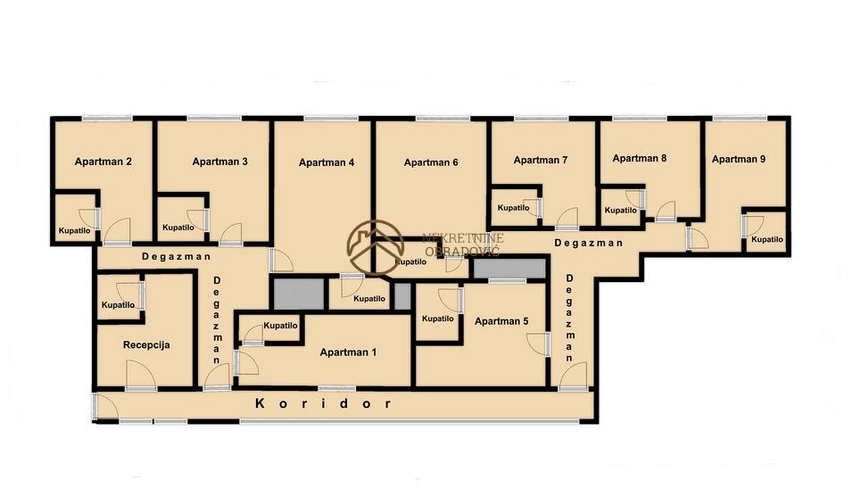 Recepcija sa kupatilom, devet apartmana sa kupatilima, degazmani, koridor.