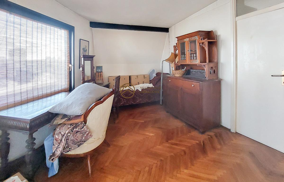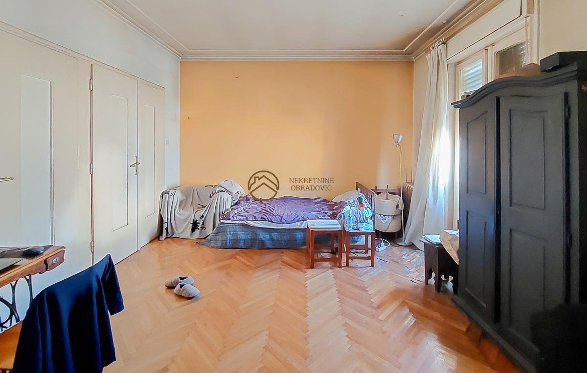 Spavaca soba je velika i vec postoje dvoje ulaznih vrata, tako da jednim pregradnim zidom se lako prave dve sobe.