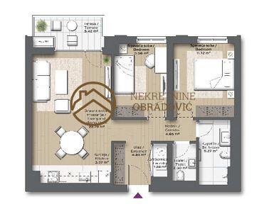 Ulazni prostor, dnevni boravak sa trpezarijom i kuhinjom, dve spavace sobe, kupatilo, toalet, tehnicka prostorija/vesernica, hodnik, terasa.