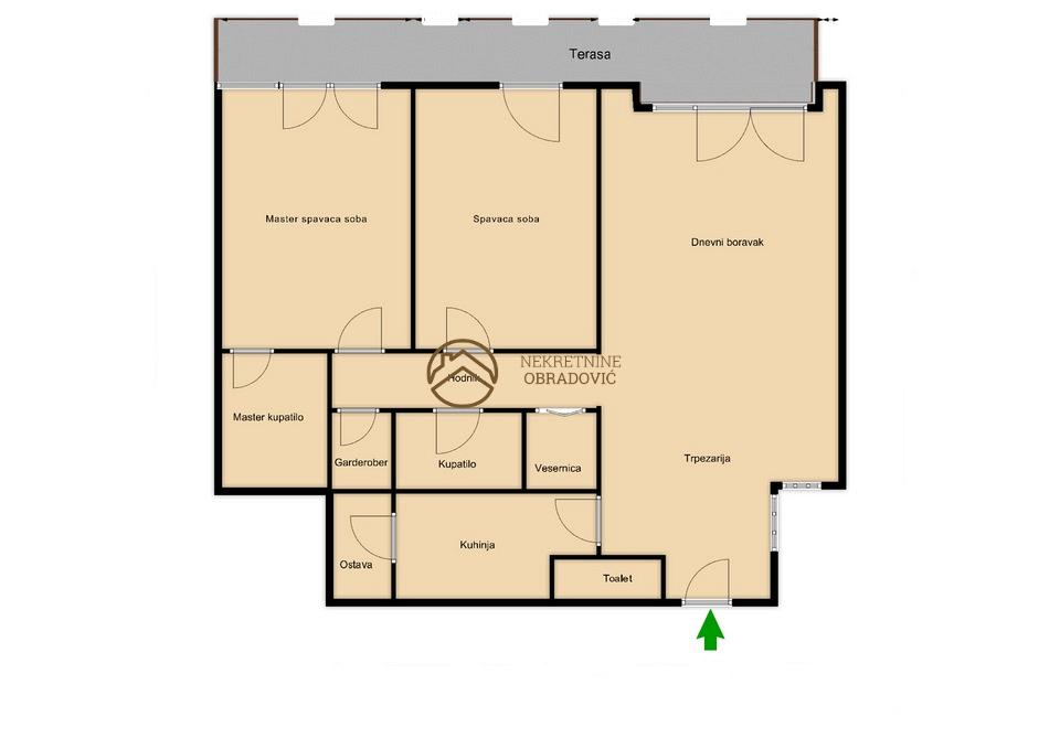 Ulazni deo, dnevno trpezarijski prostor, spavaca soba, master soba, izdvojena kuhinja sa ostavom, kupatilo, master kupatilo, toalet, degazman, garderober, vesernica, terasa.