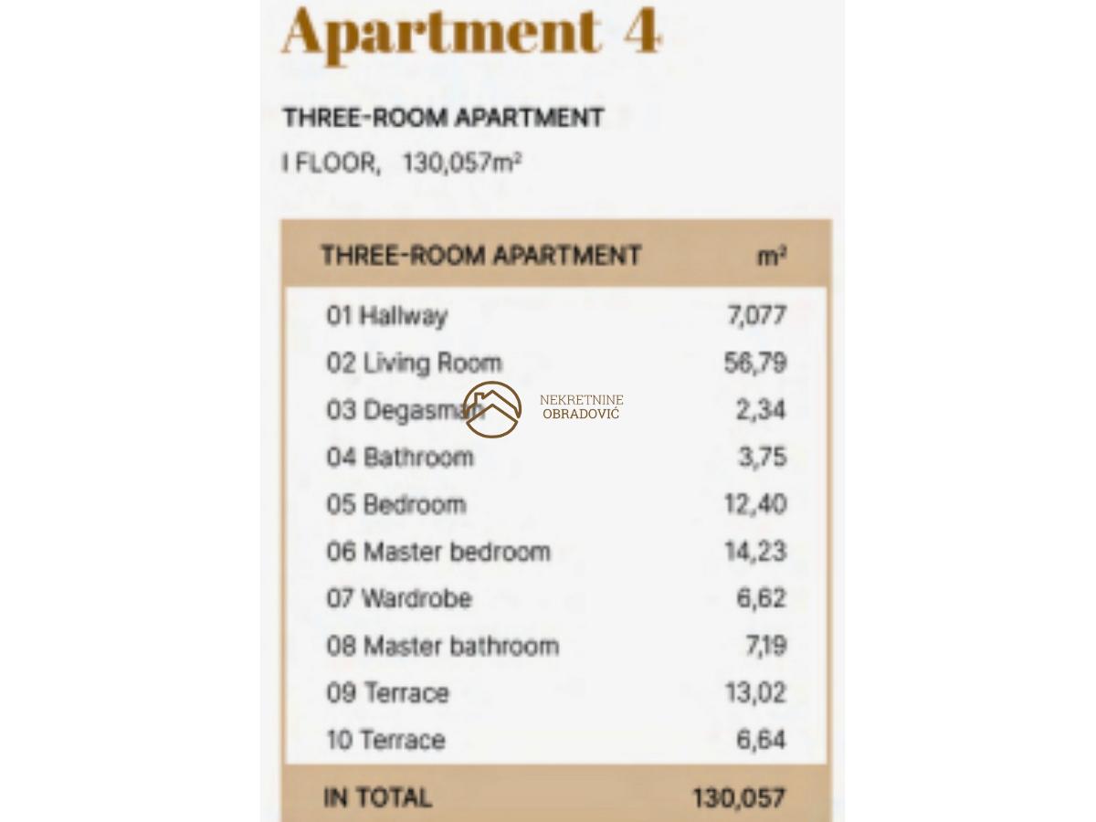 Ulazni hodnik, dnevna soba, kuhinja, trpezarija, degazman, kupatilo, spavaca soba, master spavaca soba sa master kupatilom, garderober i dve terase.