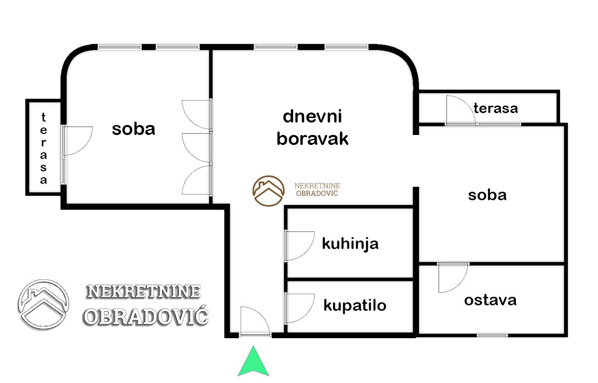 Predsoblje, kupatilo, kuhinja, dnevno trpezarijski deo, dve spavace, ostava, dve terase.
