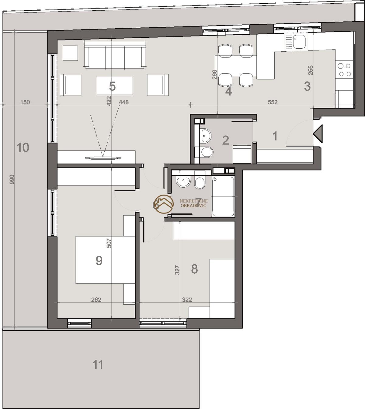 Dnevna soba, kuhinja sa trpezarijom, dve spavace sobe, kupatilo, toalet, hodnik, dve terase.