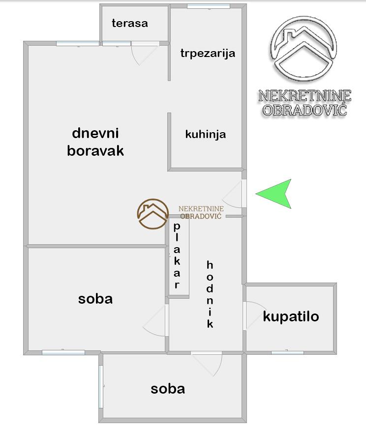Od prostorija, ova nekretnina poseduje: Predsoblje, dnevna soba, kuhinja, trpezarija, dve spavace sobe,kupatilo,terasa.